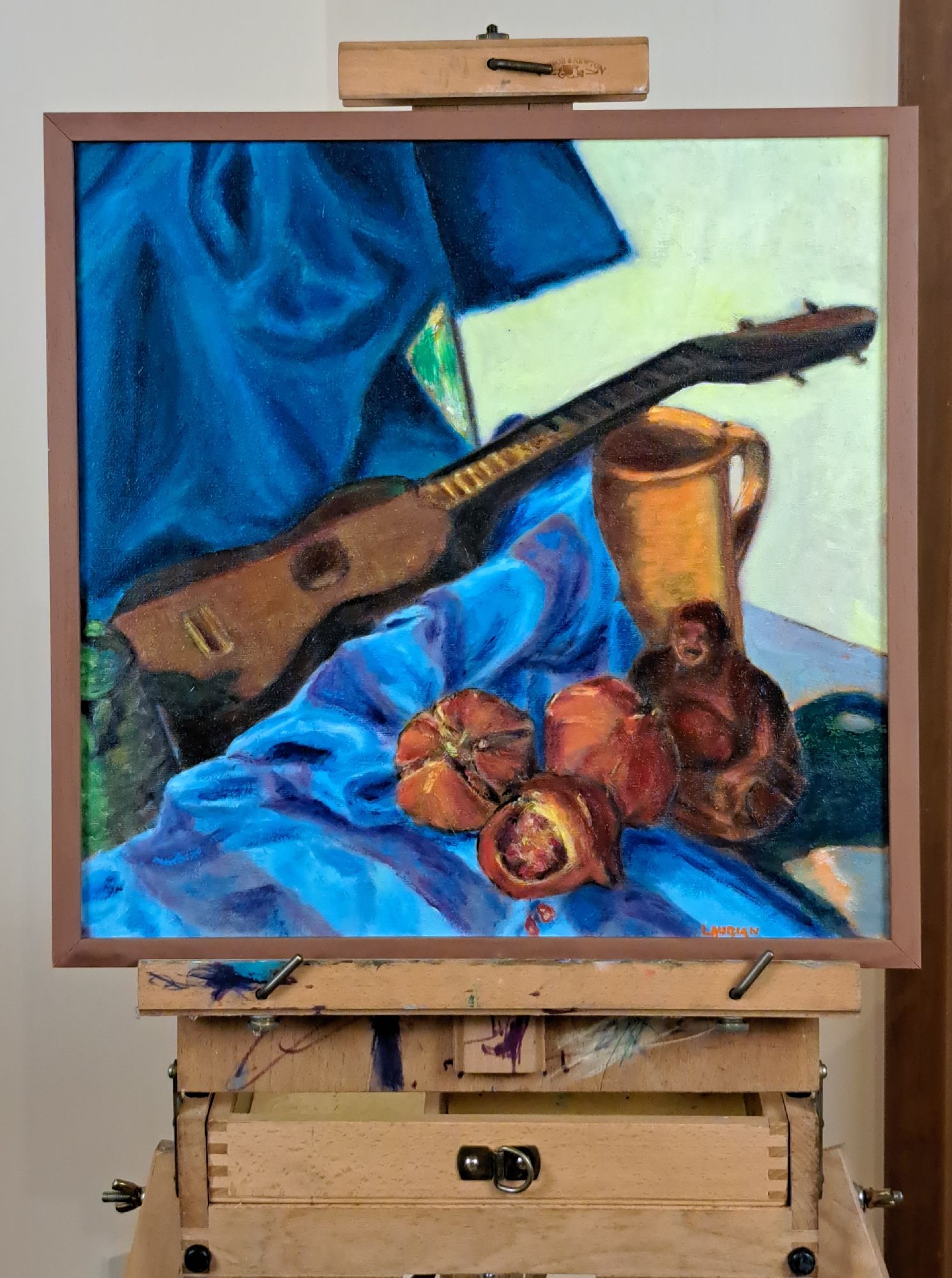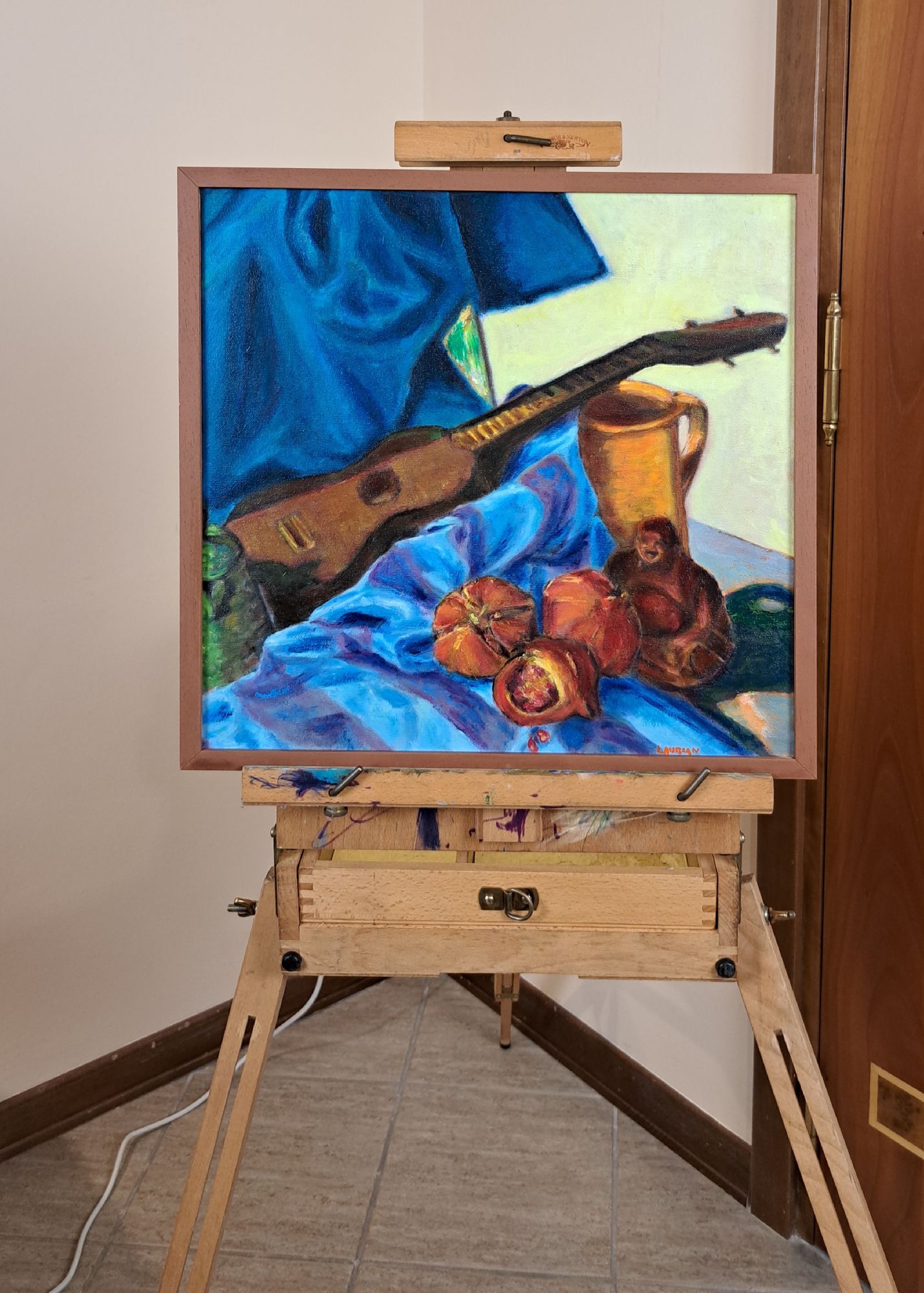 Natura morta ai piedi del Buddha ridente, con chitarra, melagrani e lampada